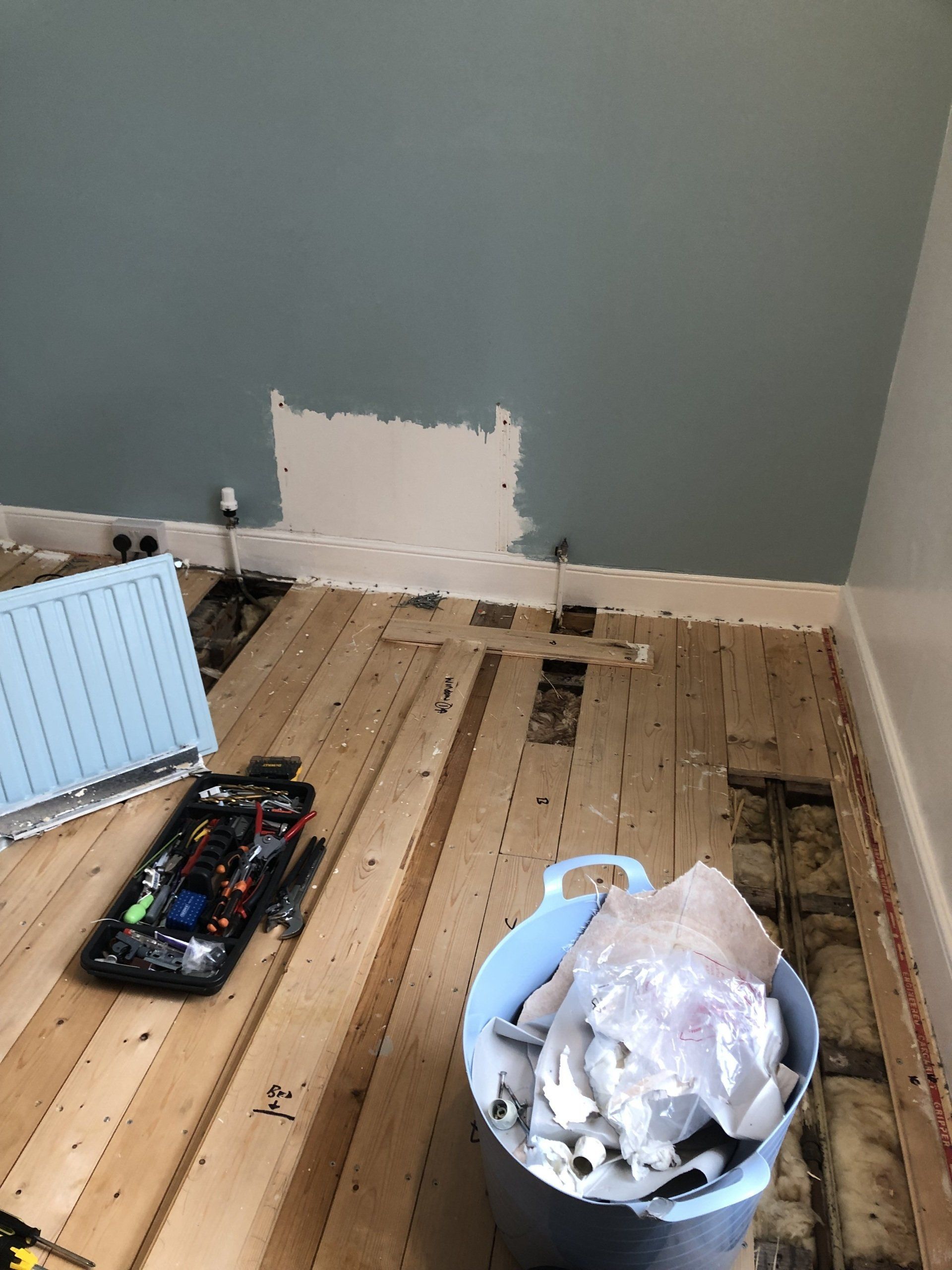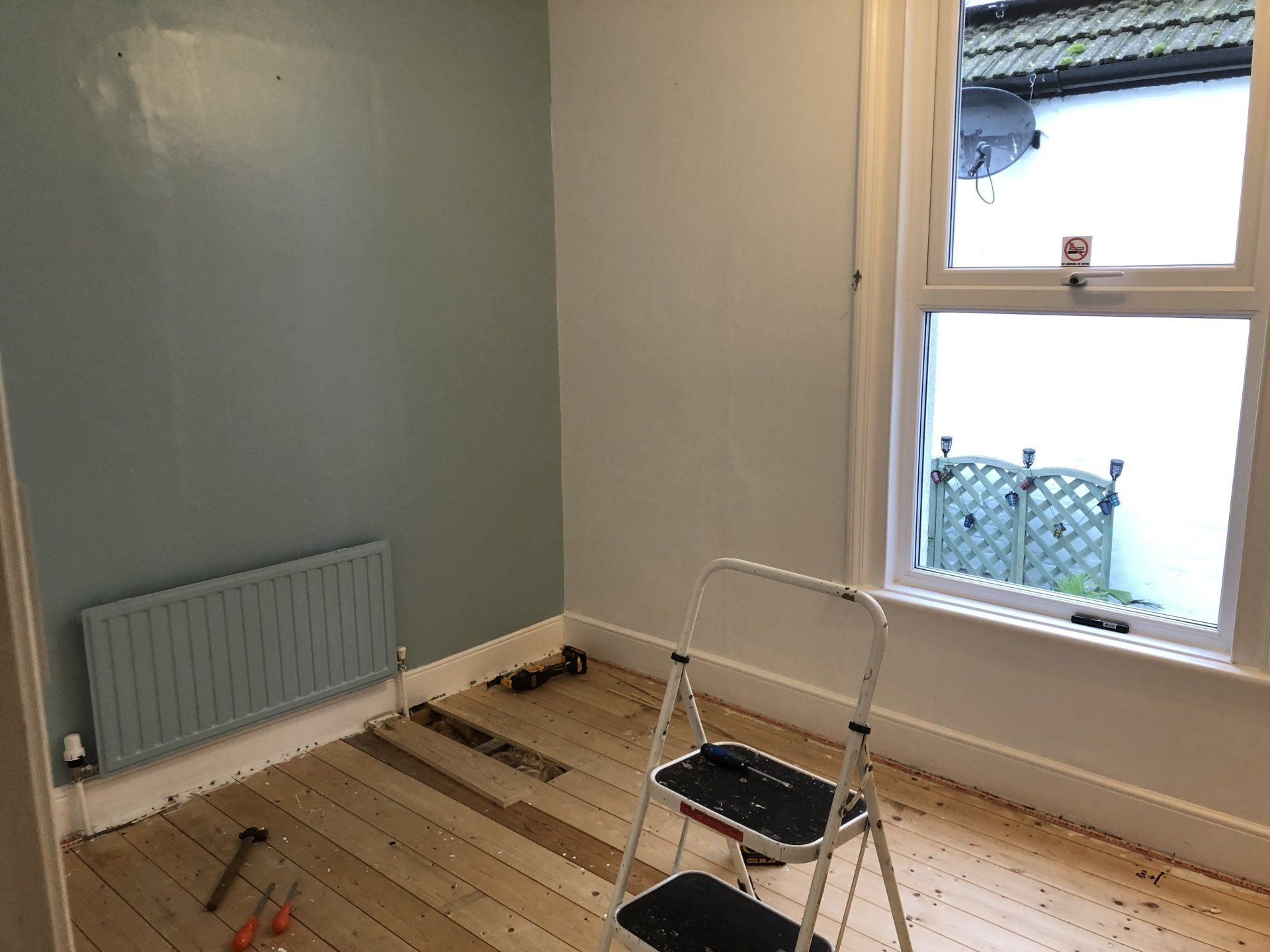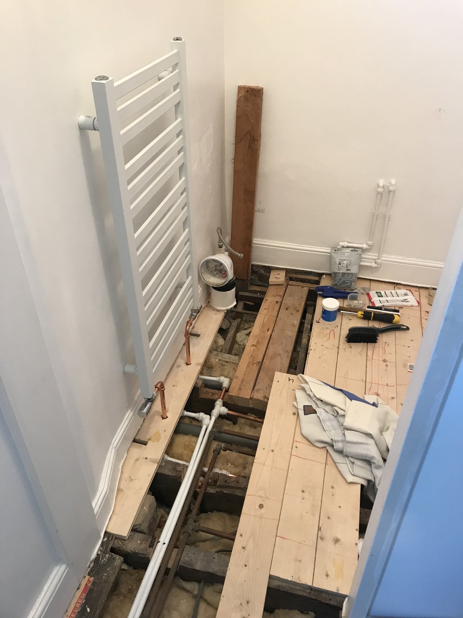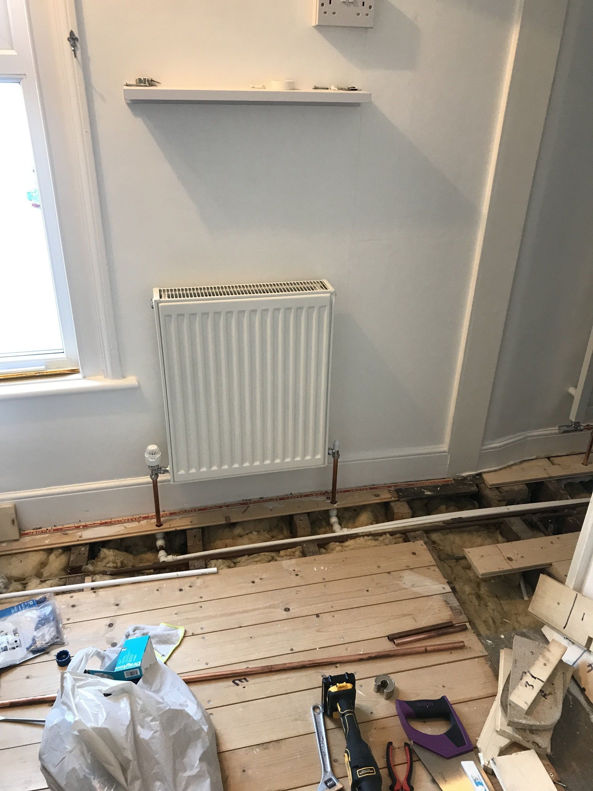 The existing radiator was ancient and badly in need of replacement. Where it was located made it difficult to adjust the temperature when the room is set up as a twin. So we decided to move the rad to a new home under the TV. We also changed the radiator in the bathroom to a more stylish towel rail.